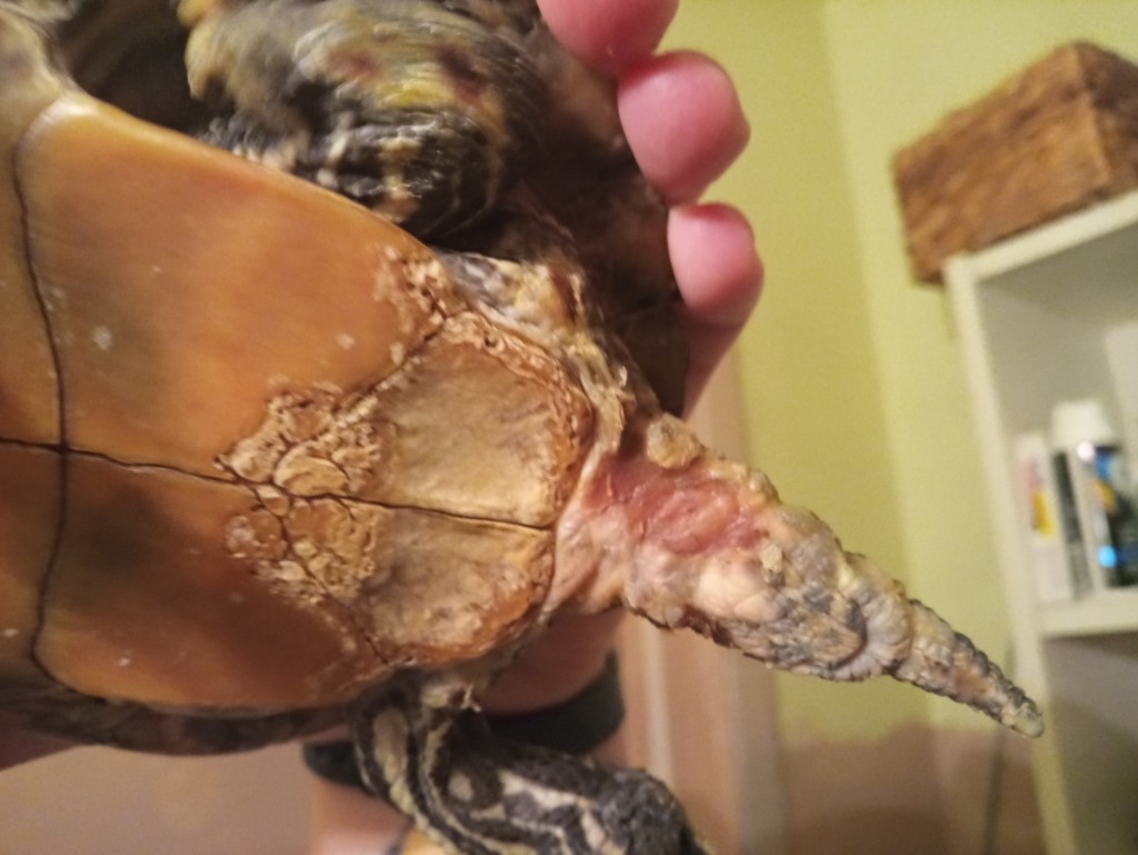He is the easiest and sweetest turtle I’ve had the privilege of caring for. Now that his tail has healed, we’re focusing on quality of life things: whittling down his beak with harder foods, exercising and play in and out of the tank, dealing with pilling on his shell, and figuring out what is up with his plastron.